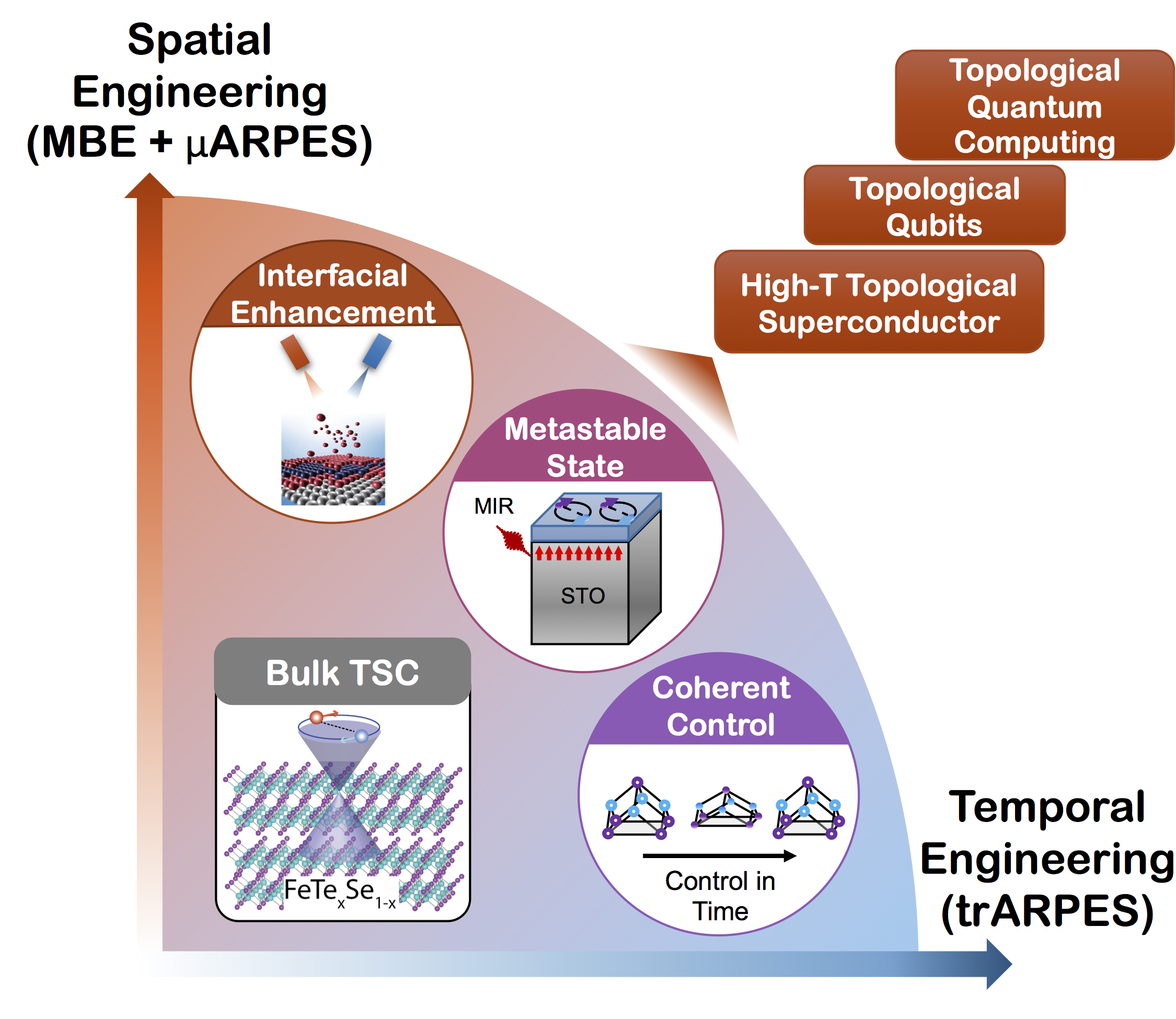 We will use our newly established Multi-Resolution Spatial and Temporal Engineering Platform (MRSTEP) to systematically control and characterize FeSeTe thin films as candidates for intrinsic high temperature TSCs. We will look into three directions: 1) programmable construction of TSCs and Majorana modes using oxide-chalcogenide superlattices; 2) light-induced metastable high temperature TSCs; 3) coherent control of topological phase transitions. These studies will not only provide novel insight into how to construct and control TSCs, but also enable us to engineer these materials for potential realizations of topological quantum computers.